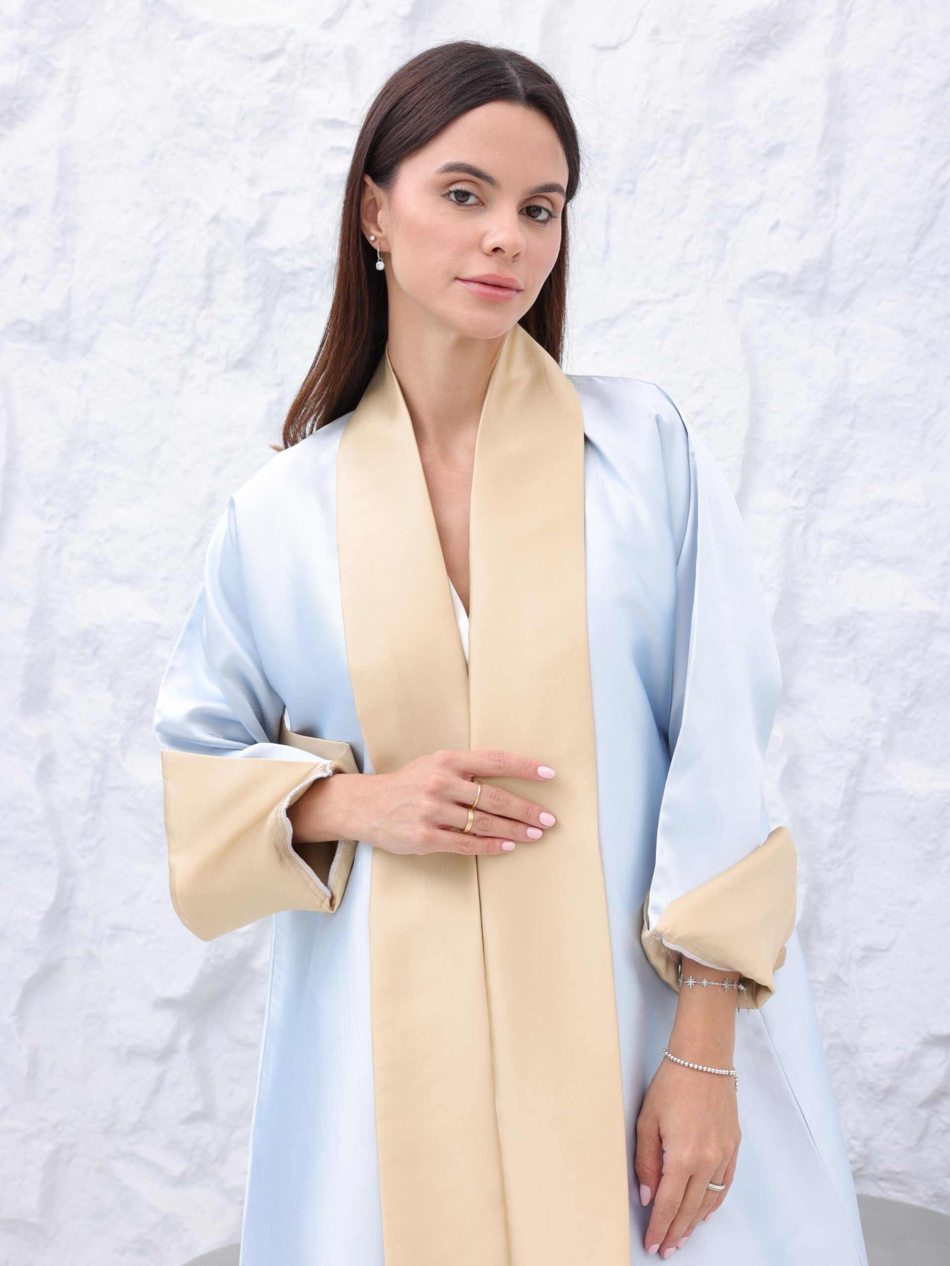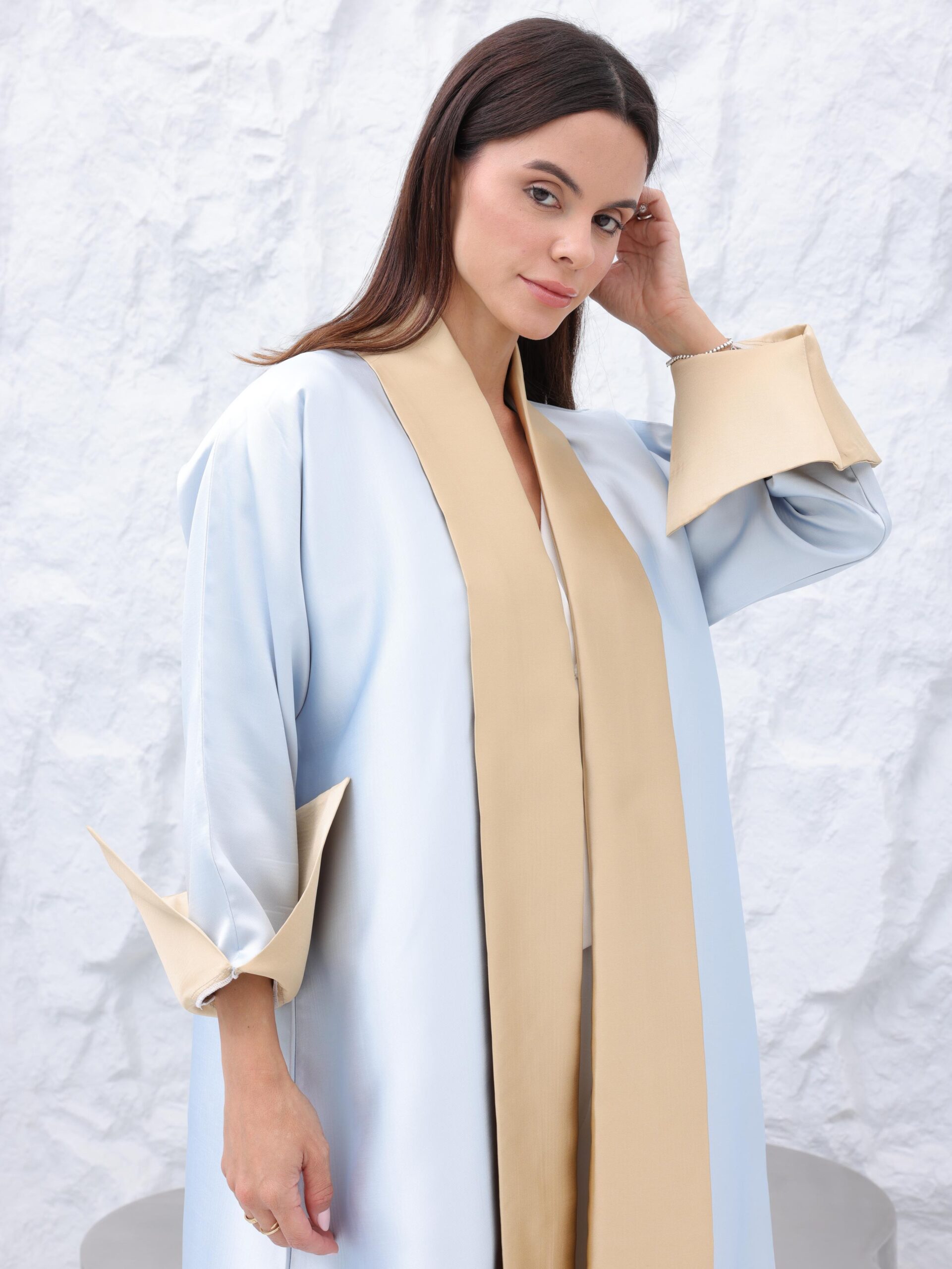 The textured 3D floral panels bloom subtly along the fabric, catching light in gentle waves. Each petal adds dimension without overwhelming the design, revealing its artistry only as you walk. The clean neckline and refined structure introduce a modern, graceful presence, transforming the abaya into a piece that feels sculpted, effortless, and distinctly luxurious.