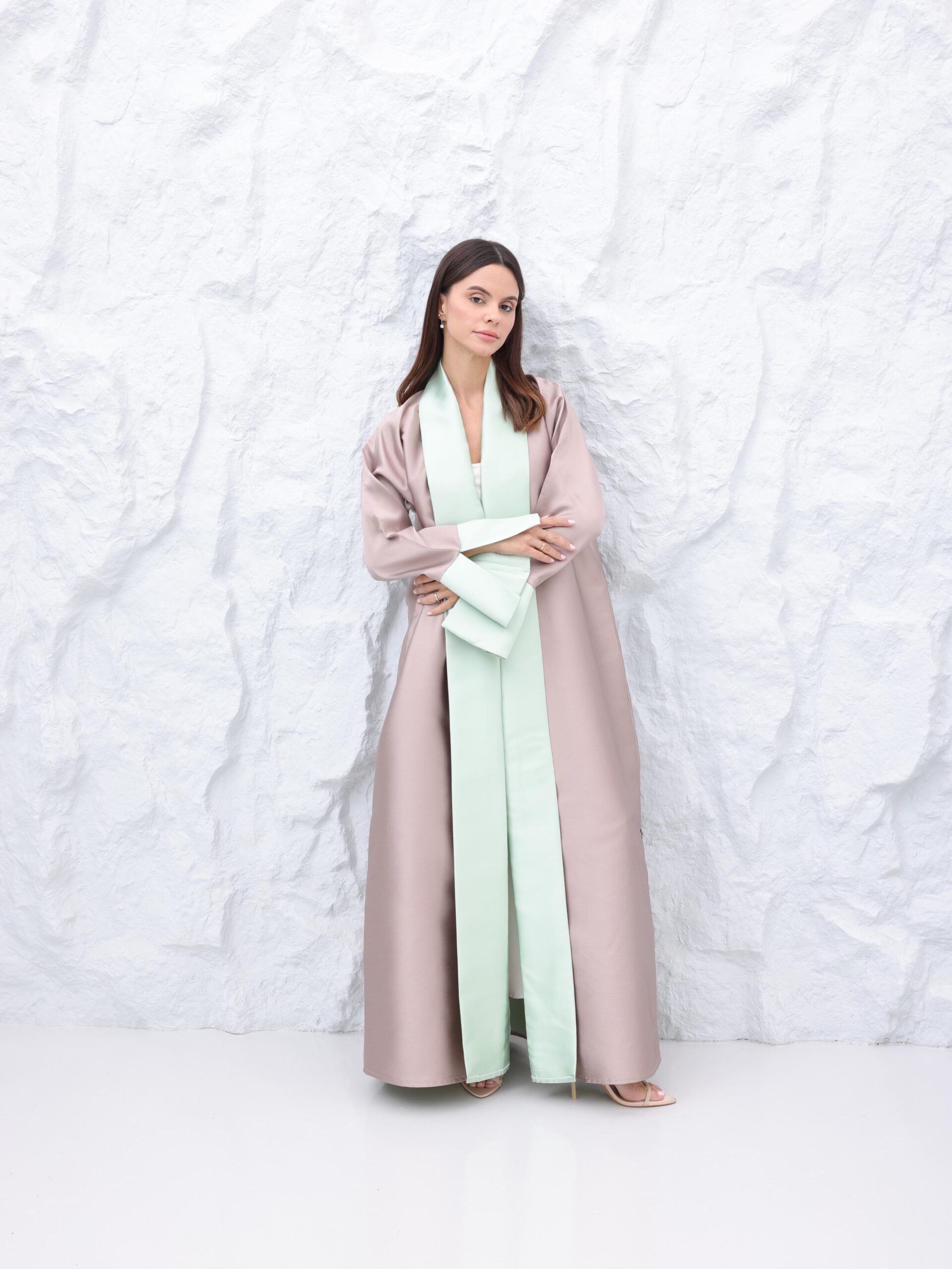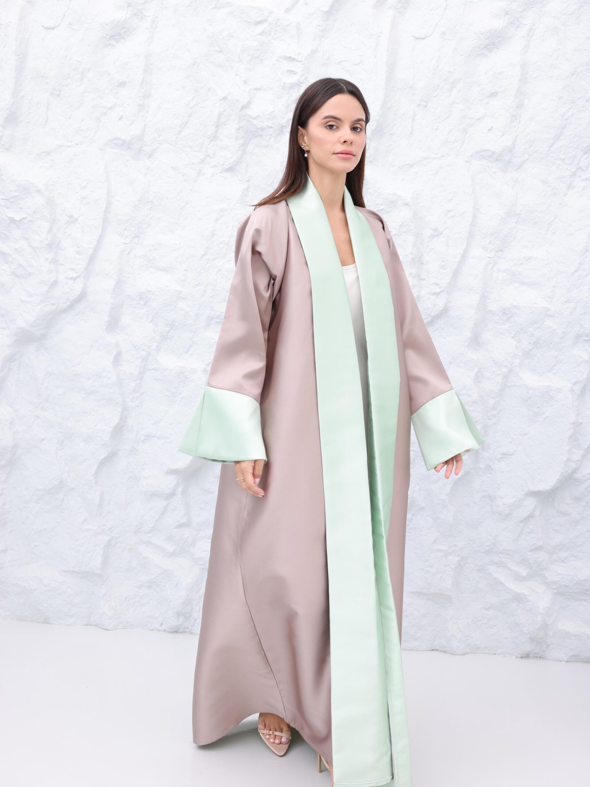 Dune Rosée envelops the silhouette in a serene blend of muted rose and cool mint, a palette that feels as soft and calming as early morning light. Crafted from fluid, satin-textured fabric, the abaya moves with quiet elegance, reflecting a delicate sheen with every step.