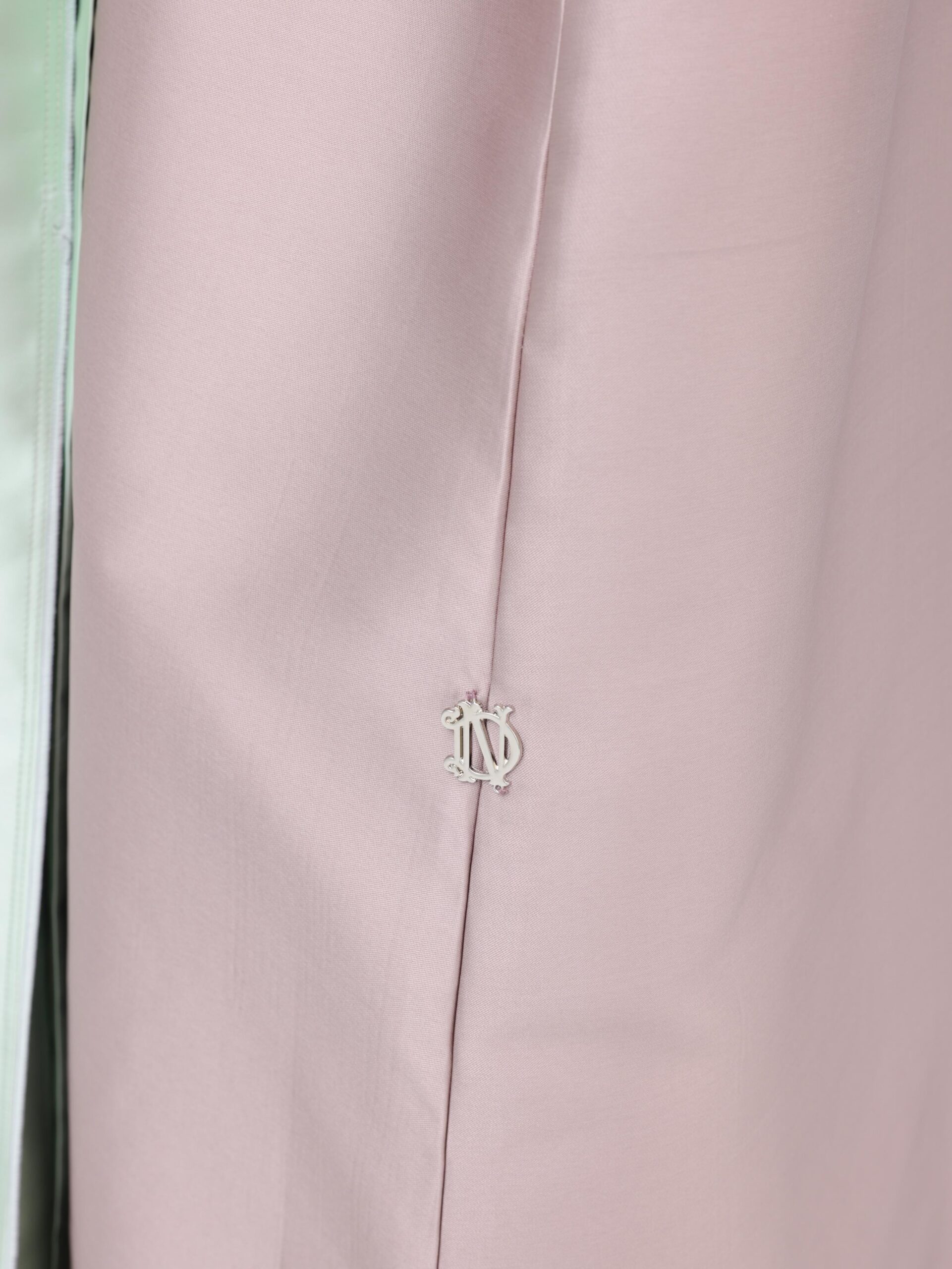 The contrasting mint lapel and cuffs create a sculpted, architectural frame subtle yet intentional, giving the piece a modern, couture-like presence. Soft pleats fall effortlessly, offering a refined balance between structure and fluidity.