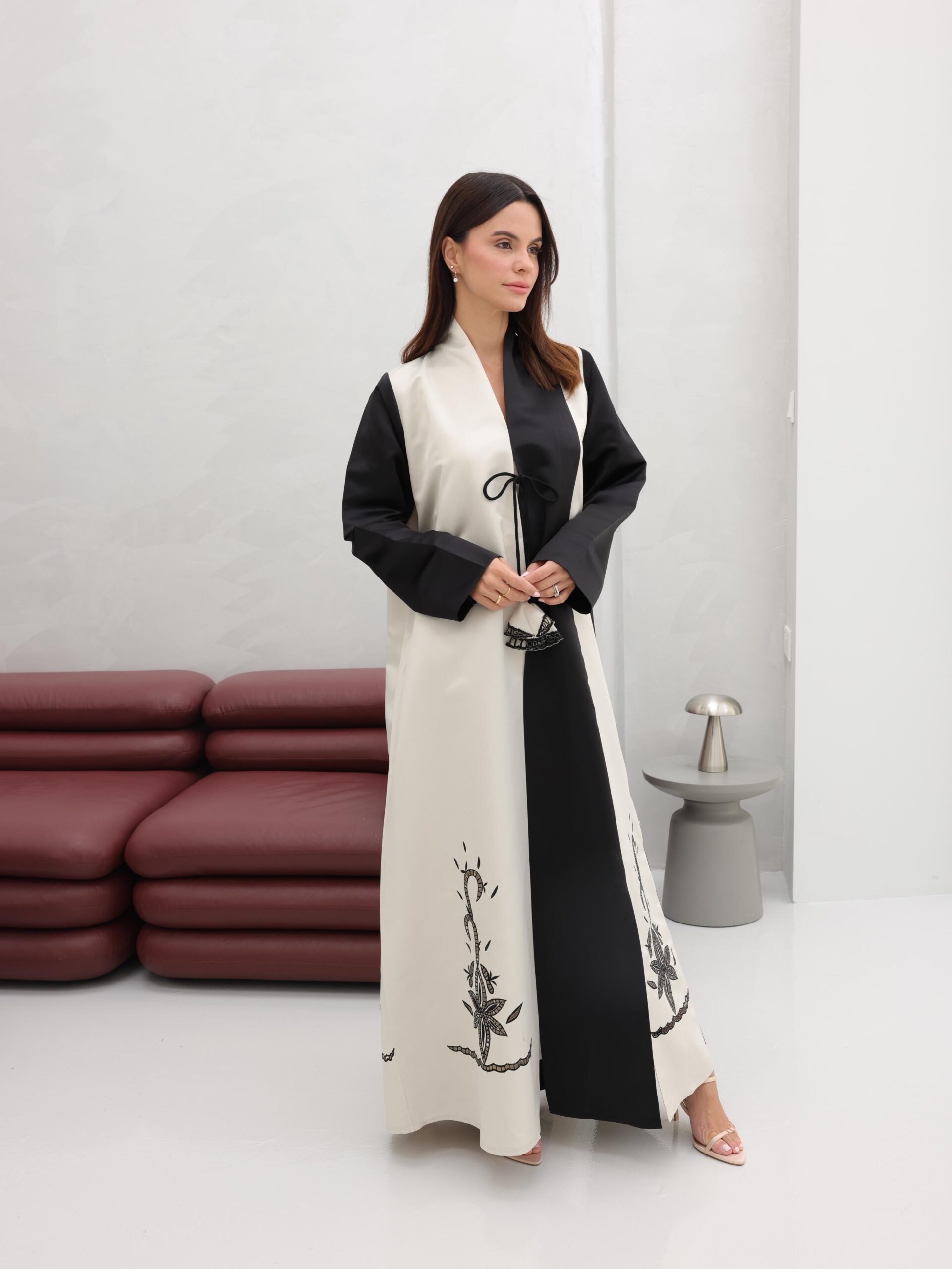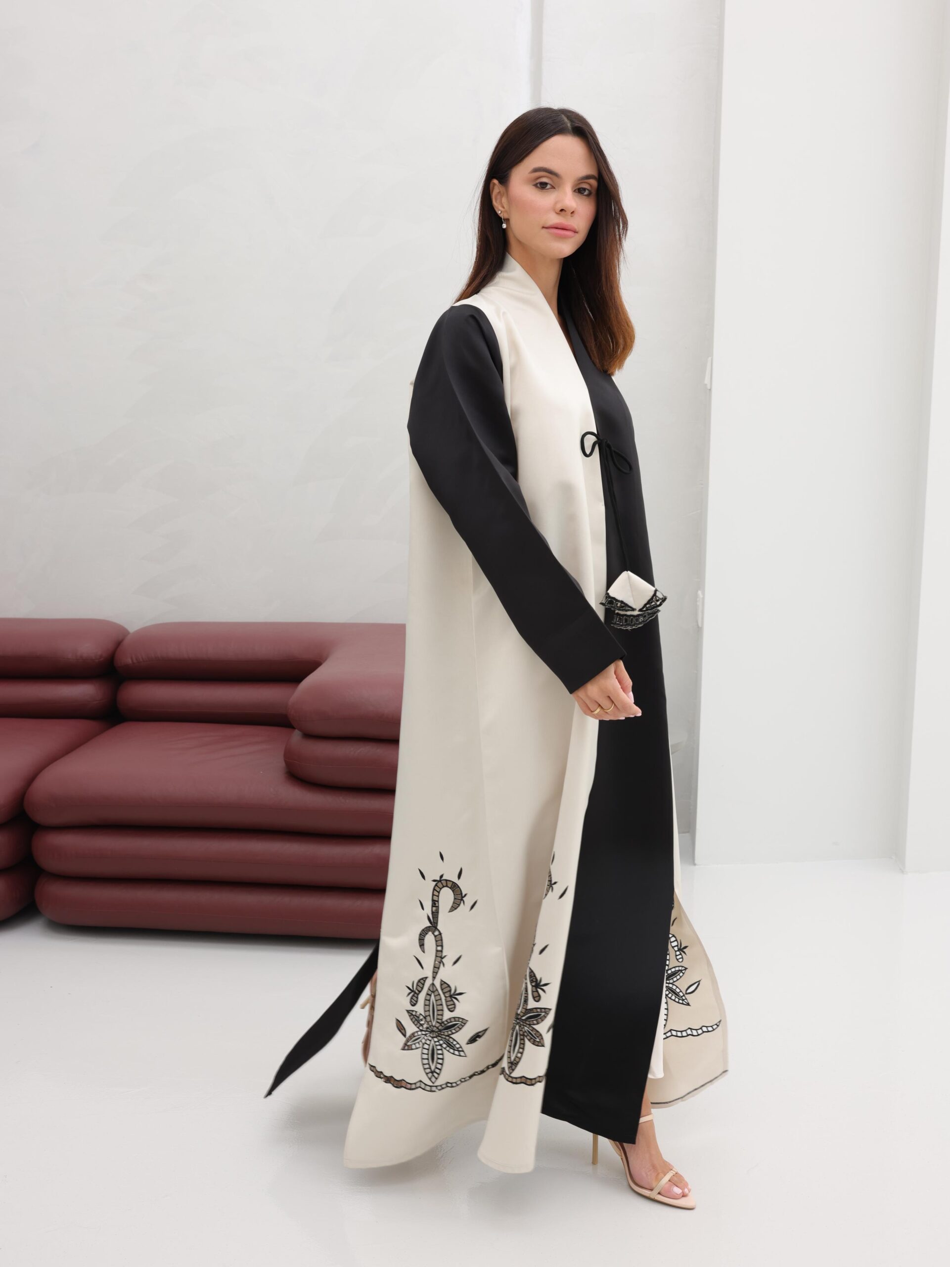 Intricate floral-inspired embroidery decorates the lower panels, revealing subtle patterns as the garment moves — a gentle shimmer that elevates the design while keeping it timeless. The softly rounded neckline and fluid cut enhance its feminine presence, allowing the abaya to glide with poised elegance.