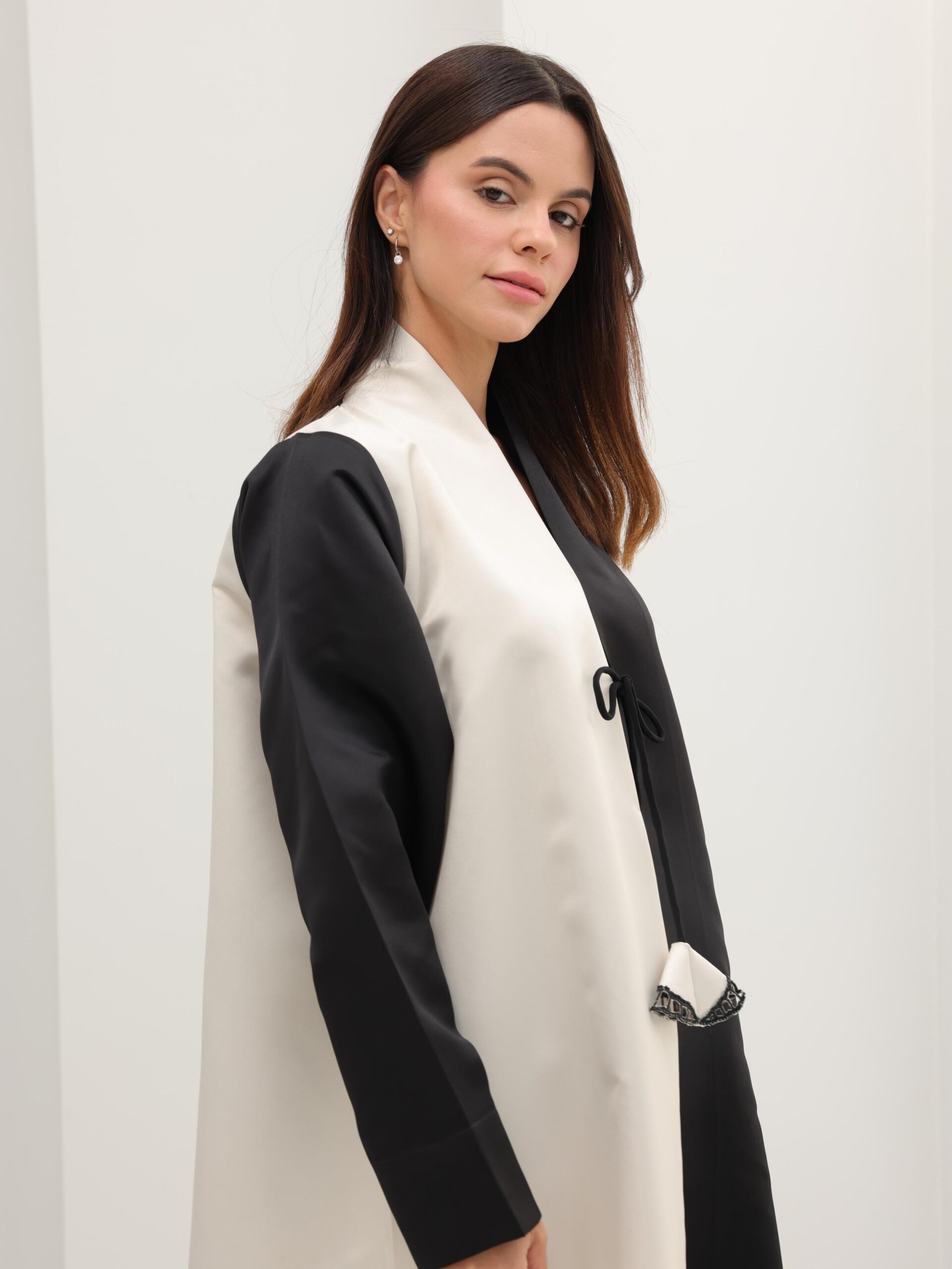 Ivory Serenade is a study in softness and refined contrast. Draped in a warm, creamy ivory, the silhouette falls with effortless grace, creating a glow that feels both delicate and distinguished. The structured black detailing shapes the piece with quiet definition, adding depth without disrupting its serene flow.