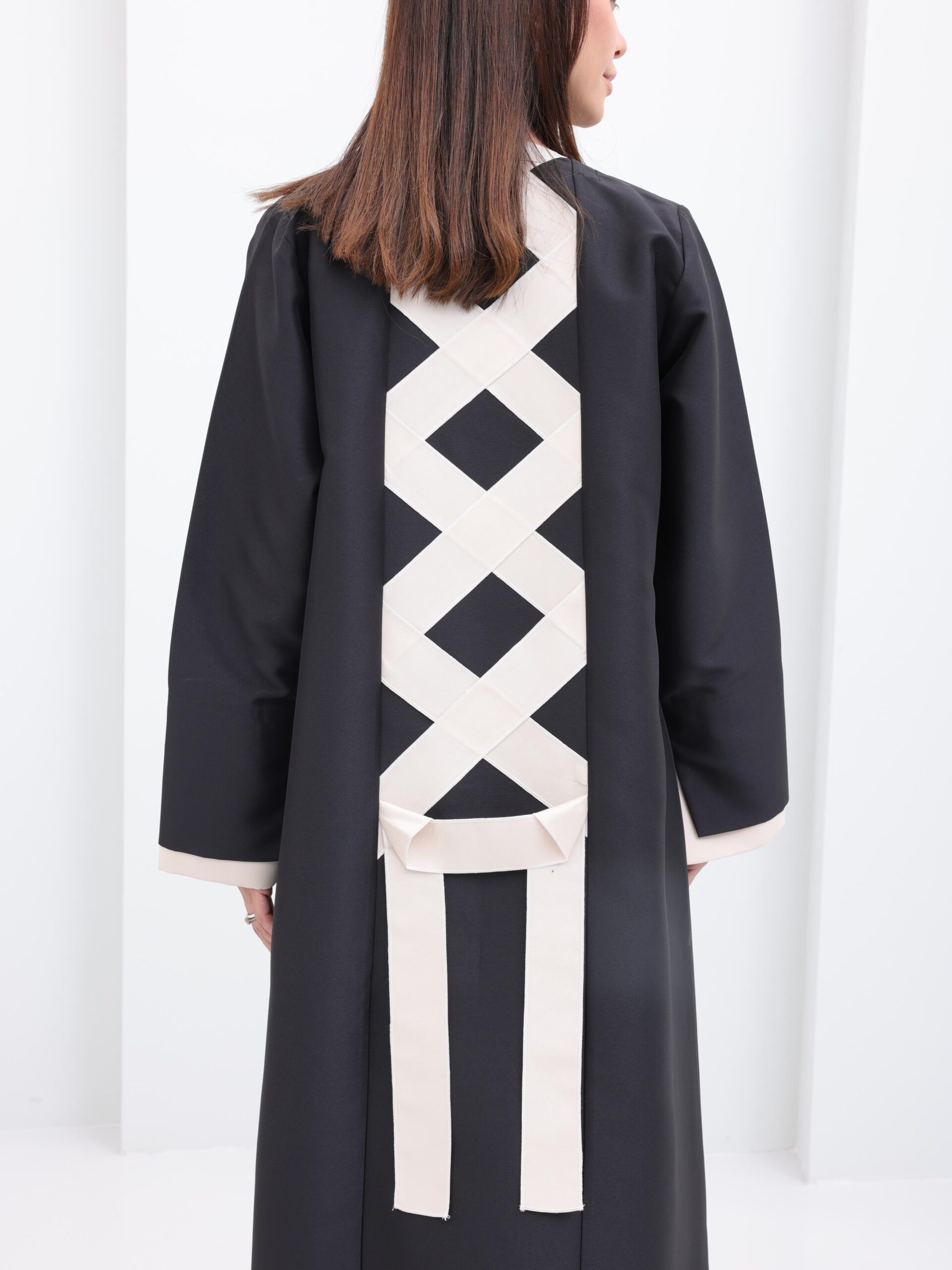 A striking ivory lattice runs down the center of the back—an intricately interwoven pattern that feels both modern and timeless. Its geometric precision adds depth and structure, while the soft trailing ribbons conclude the design with a gentle, graceful fall. This contrast of sharp symmetry and fluid movement gives the piece its unmistakable poetry.