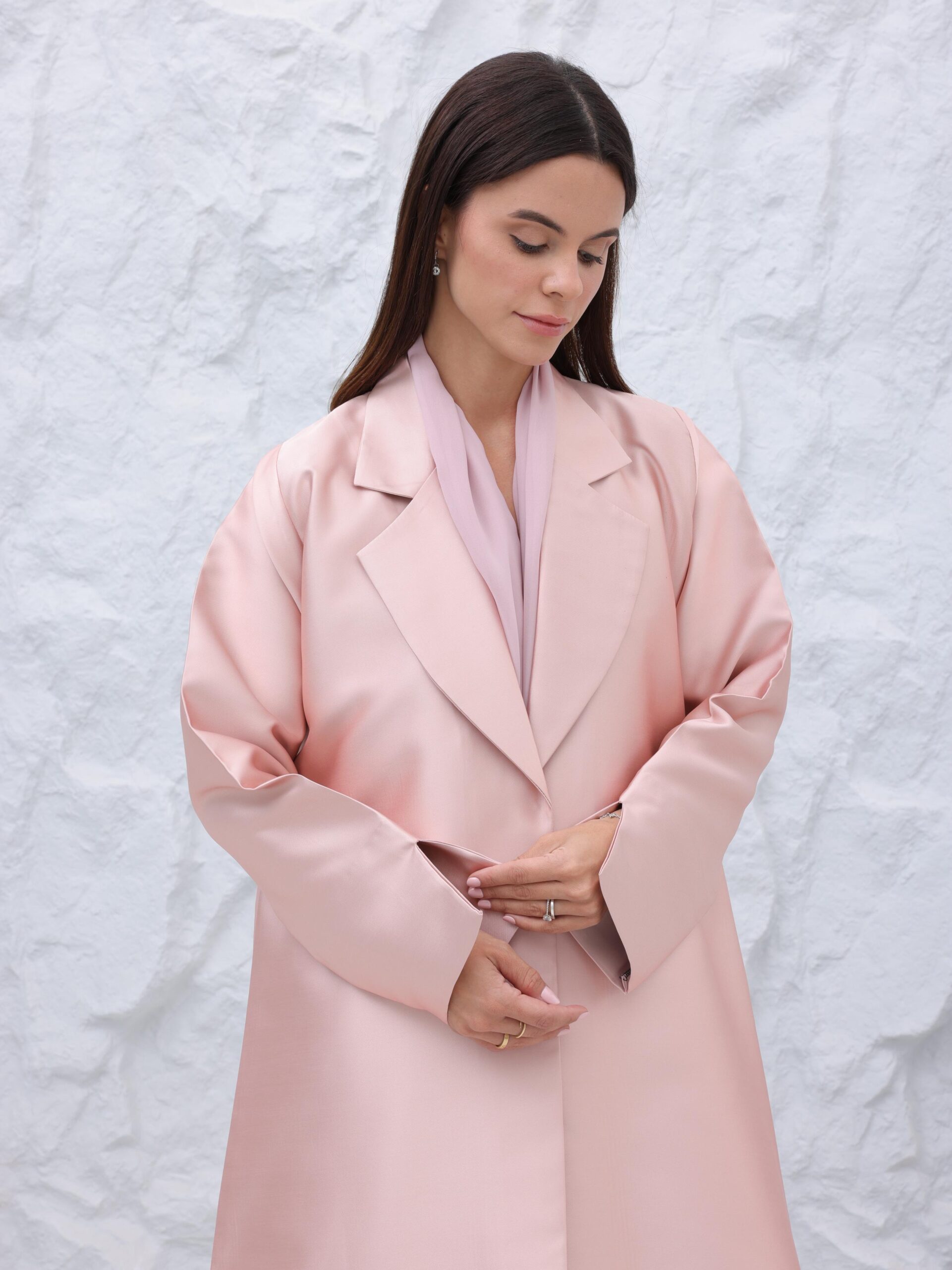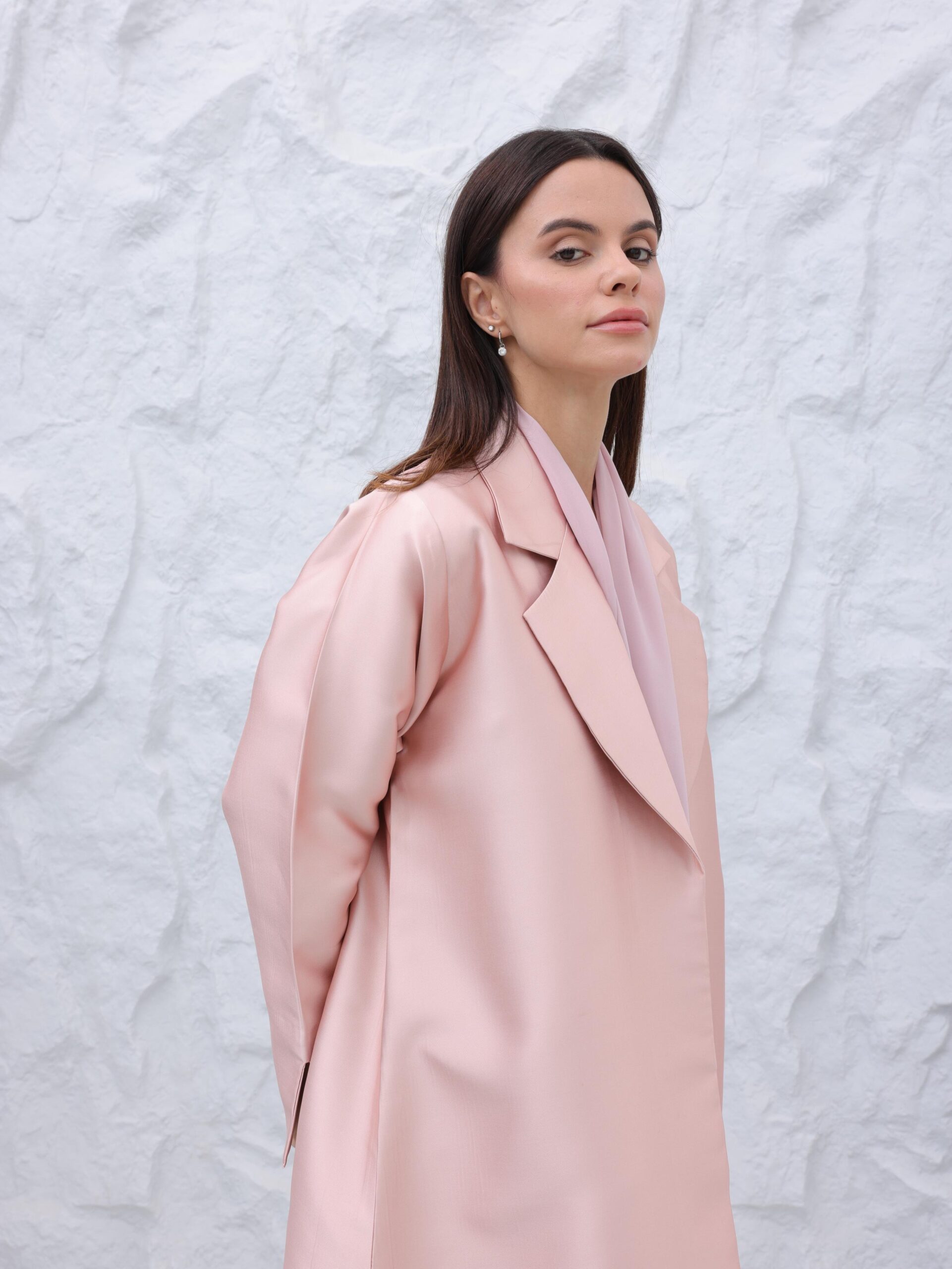 Blush Essence captures the harmony of soft femininity and elevated luxury. Designed in a refined, rosy blush tone with a smooth, satin-like finish, this piece embodies understated elegance. Its tailored lapels and clean front closure create a structured silhouette, while the flowing drape maintains a sense of effortless grace.